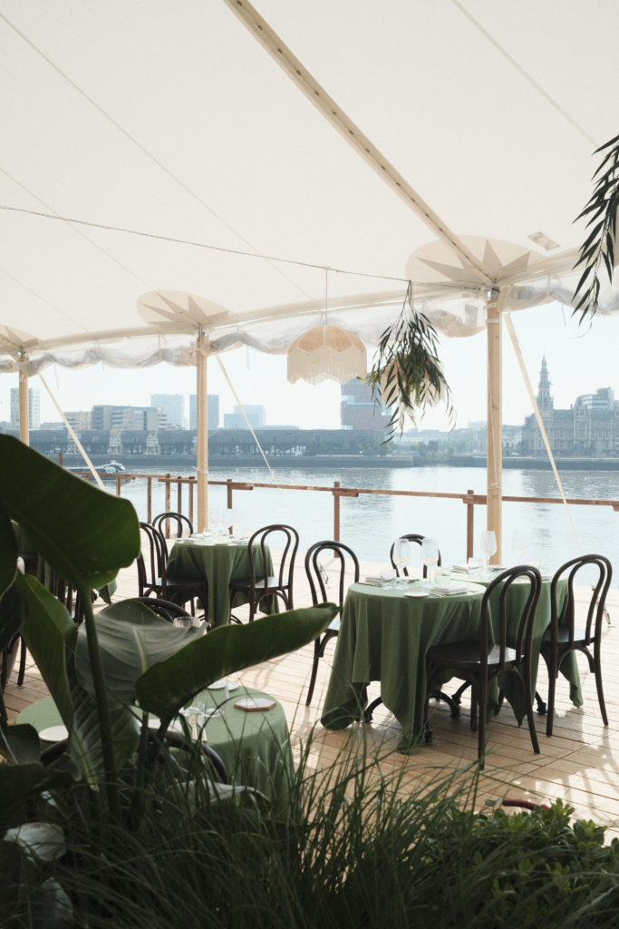 Ontdek Pampelonne, onze verborgen zomerplek aan de Schelde. Een elegante pop-up, verscholen tussen het groen, met een prachtig uitzicht op de Antwerpse skyline. Hier geniet je in een ontspannen sfeer van lange zomeravonden, smaakvolle gerechten en goed gezelschap.